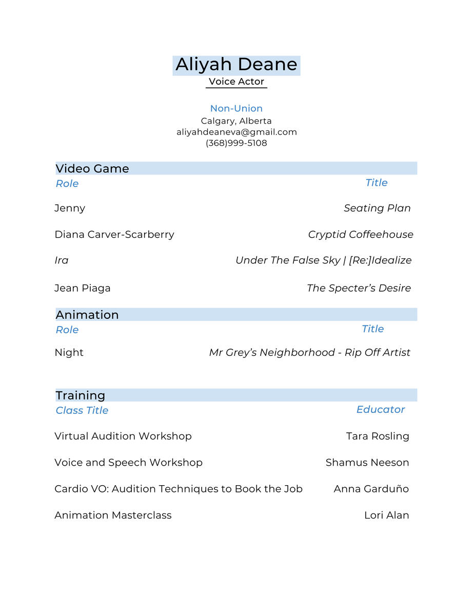 Aliyah Deane is a Jamaican-Canadian voice actress who's always had a love of theatre and acting, and wants nothing more than to bring voices to unique and beloved characters.Looking for the voice of a child, teen or adult? Looking for innocence? Or mischievousness? Or maybe even full-on creepiness?If you’ve answered yes to any of these, then you’ve certainly come to the right place!
